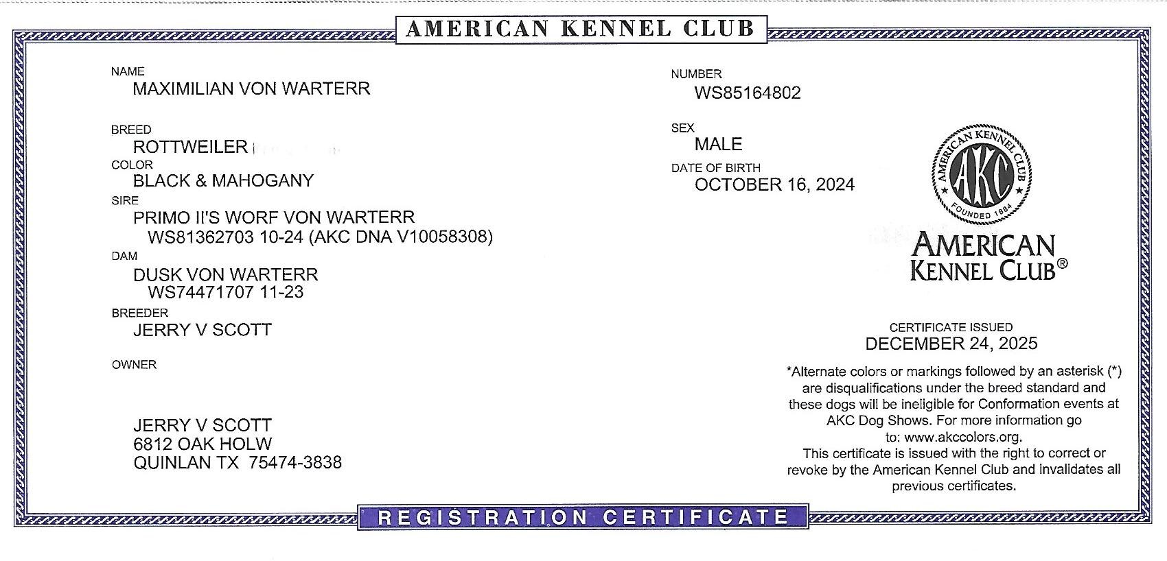 AKC Champion, UCI International Adult Champion, AIRK SLRK Winter Youth Sieger 2011, AIRK SLRK Spring Best Youth Male in Show 2011, NIRK TRC Youth Sieger 2010, Multi V1-Rated