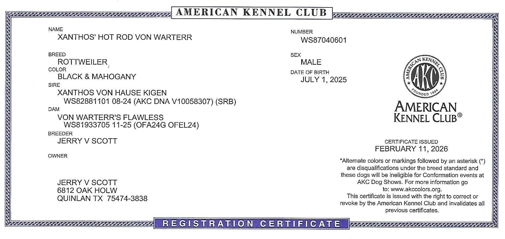 AKC Registration #WS87040601